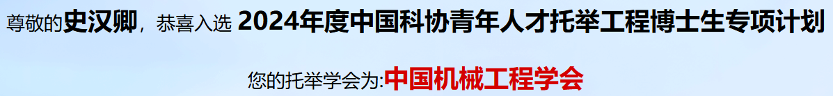 近日,中国科协公布了2024年度中国科协青年人才托举工程博士生专项计划入选者名单。黄庆学院士团队2021级博士研究生史汉卿成功入选,托举学会为中国机械工程学会。