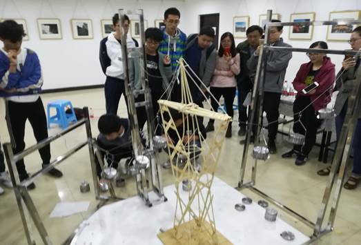 比赛当天,各队队员携带制作的模型陆续来到比赛场地,比赛正式开始。在志愿者的帮助下,第一支队伍开始进行加载测试。所有人把目光都聚集在第一组的模型上,气氛变得格外紧张,但他们最终以一级加载失败告终,随后的几组也同样没有通过一级加载。当其他队伍面对困难退缩的时候,永利官网队员做好准备,主动要求提前进行加载测试。他们配合默契,成功完成了一级加载,现场气氛也变得活跃起来,紧接着,他们又顺利完成了二级加载。现场响起阵阵掌声。由此,永利官网作品成为在A轮比赛中第一个通过二级加载,也是A轮比赛中32组参赛队伍中仅有的两组通过二级加载的小组之一。由于B轮赛程安排与专业课程安排冲突,永利官网队伍未参加B轮比赛,最终获得二等奖(第6名)。