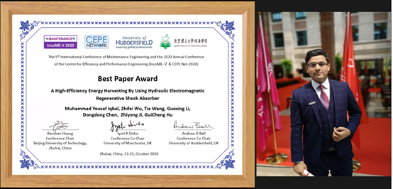 2020年10月25日,我校机械与运载工程学院博士研究生Muhammad Yousaf Iqbal(富裕)获得第5届维护工程国际学术会议(The 5th International Conference of Maintenance Engineering)暨效率与性能研究全球合作组织年度会议颁发的“最佳论文奖”。机械与运载工程学院教师李国兴副教授应邀作专题报告并获颁“主旨演讲奖”。