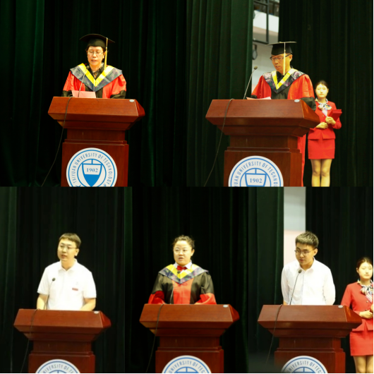 副院长熊晓燕宣读《关于授予2023届博士、硕士、学士学位的决定》。副院长赵敬伟宣读《关于表彰2023届优秀毕业生的决定》。学院为优秀毕业生颁发荣誉证书并赠送“星光台”,希望受到表彰的同学们继续发挥先锋模范作用。马国祯老师作为教师代表发言,鼓励毕业生们将基础研究和工程技术结合,从工程角度造福国计民生。2019级博士生张晶晶、机电1908班裴智明同学代表全体2023届毕业生发言,表达对母校和学院的感恩之情,表示在今后的学习和生活中要踔厉奋发,挺膺担当。