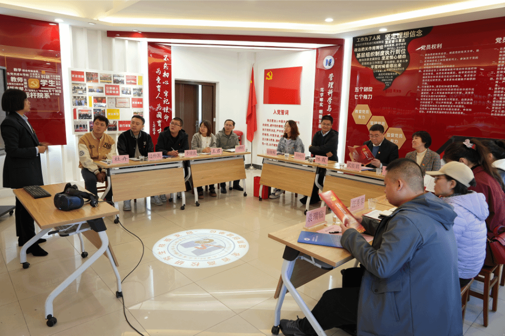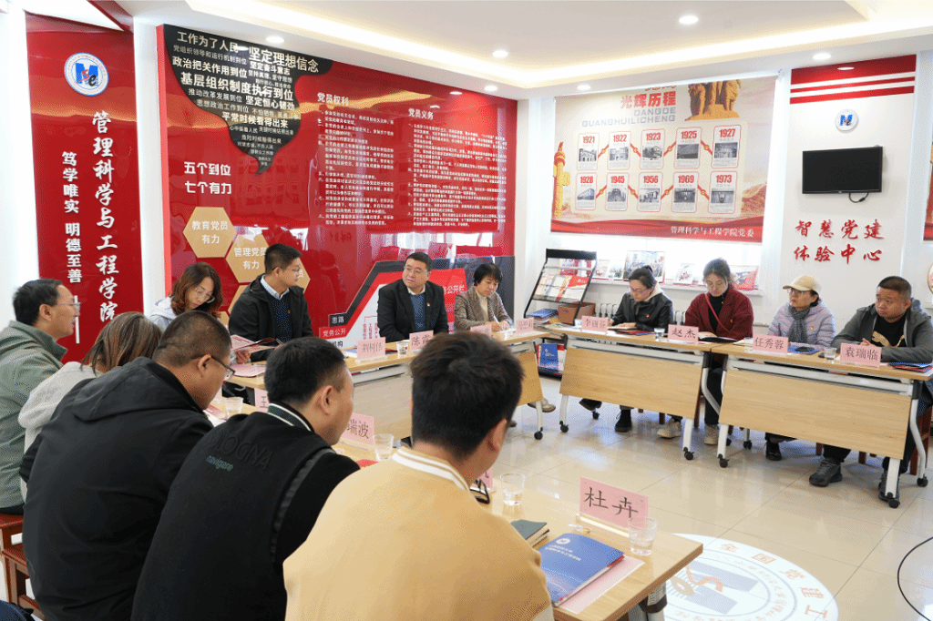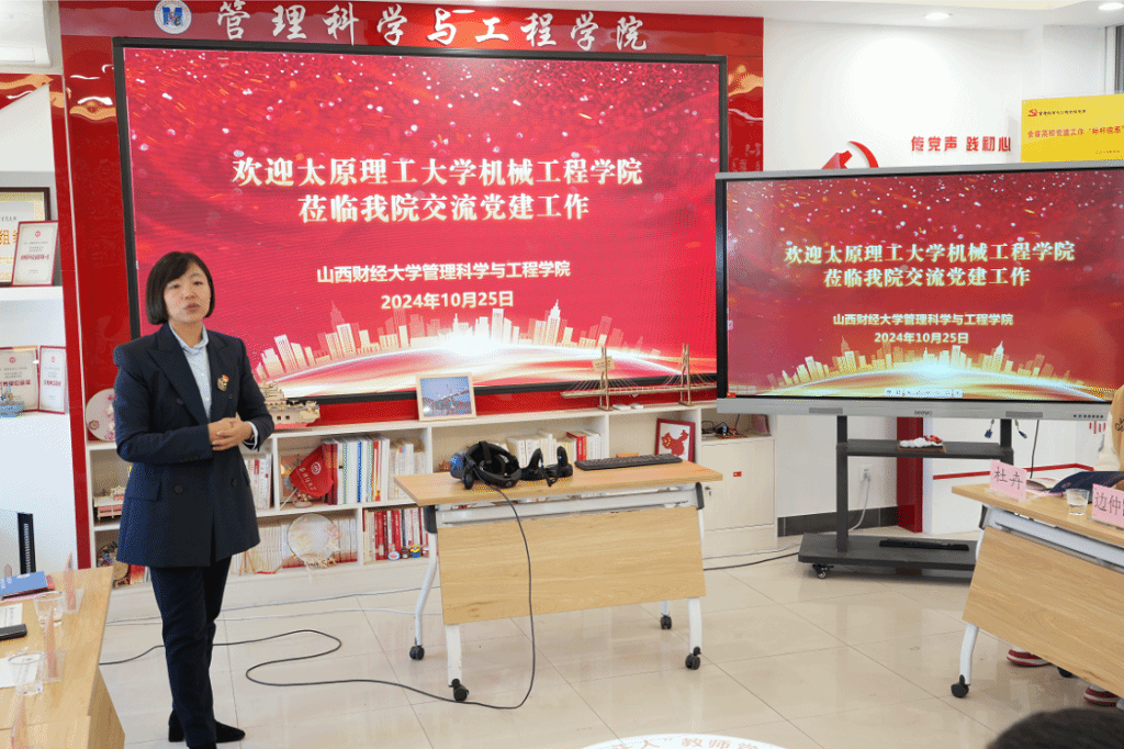 为深入贯彻落实新时代党建工作要求,贯彻落实校党委党建工作五化建设任务,对标先进,积极推进学院党建工作高质量发展。1025日上午,党委书记武佐君,党委副书记马丽莉,党政办主任赵俊梅,组织员、党支部书记、青年教师代表等一行赴全国党建工作标杆院系、山西财经大学管理科学与工程学院党委开展交流学习。山西财经大学管理科学与工程学院党委副书记陈霞、副院长荆树伟,全国党建工作样板支部、工程造价党支部书记白鹏锐等参加交流学习活动。