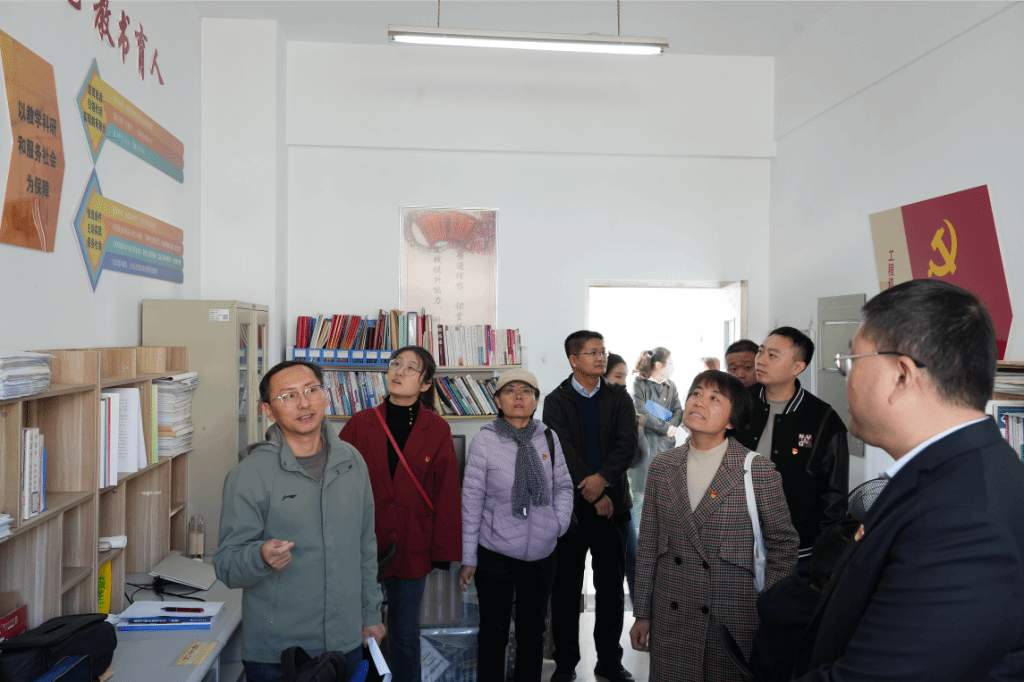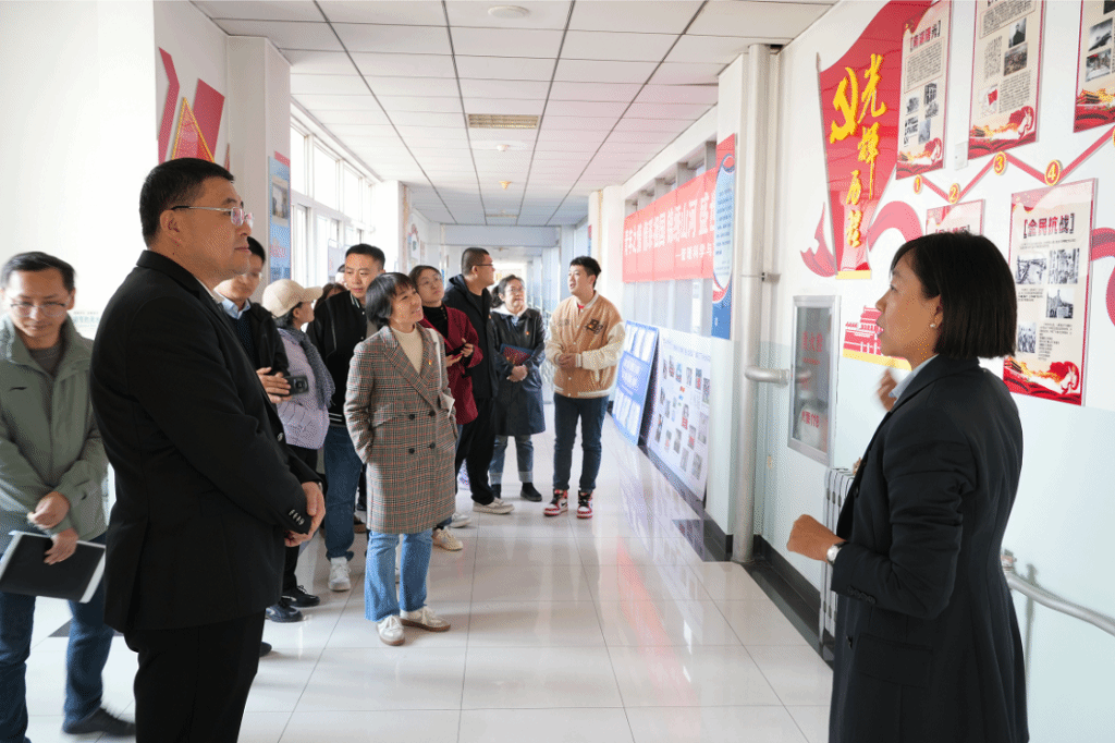 陈霞、荆树伟、白鹏锐带领武佐君一行参观了百米红色长廊、党员活动室、工程造价党支部等党建活动阵地。她指出,通过邀请党的二十大代表进行宣讲、观看具有红色意义的话剧等活动,建立起党员培训场景化和党员教育情景化的具有鲜明特色的双化教育模式。她强调,利用情景模拟+互动体验的方式,可以实现党建阵地建设标准化、数字化,增强党建工作与智能信息技术的深度融合。白鹏锐表示,工程造价党支部形成了以立德树人为基本核心,以教学科研和服务社会为根本保障的适用于高校教学团队发展的一体两翼育人模式。