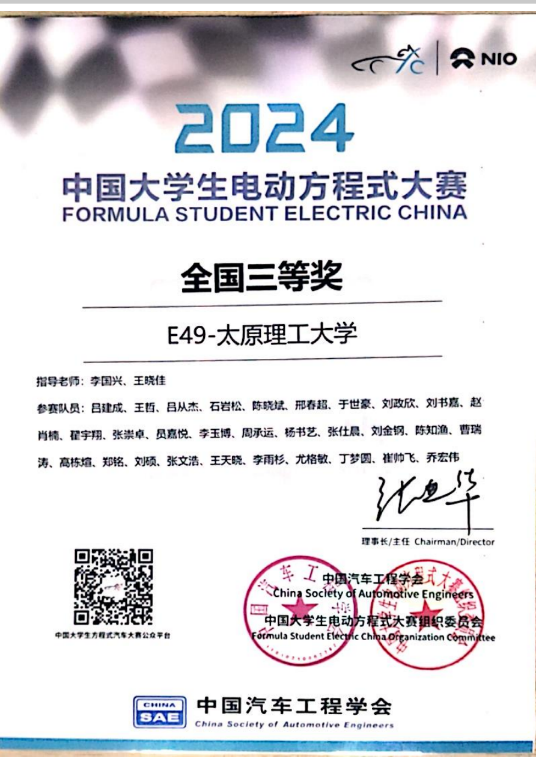 永利官网晋翔车队在10月底结束的两项实车参赛的比赛中取得佳绩,荣获2024“蔚来杯”中国大学生电动方程式大赛(FSEC)国家三等奖,荣获2024壳牌汽车环保马拉松中国赛最佳外观奖。比赛由王晓佳、李国兴老师带队。