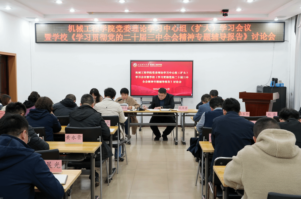 114日下午,院党委在机械馆二层一号会议室召开第五次理论学习中心组(扩大)学习会暨学校学习贯彻党的二十届三中全会精神专题辅导报告讨论会议。院领导班子成员,三办一委负责人、工会主席、系部中心主任、组织员和各党支部书记参加会议。院党委书记武佐君主持会议并讲话。