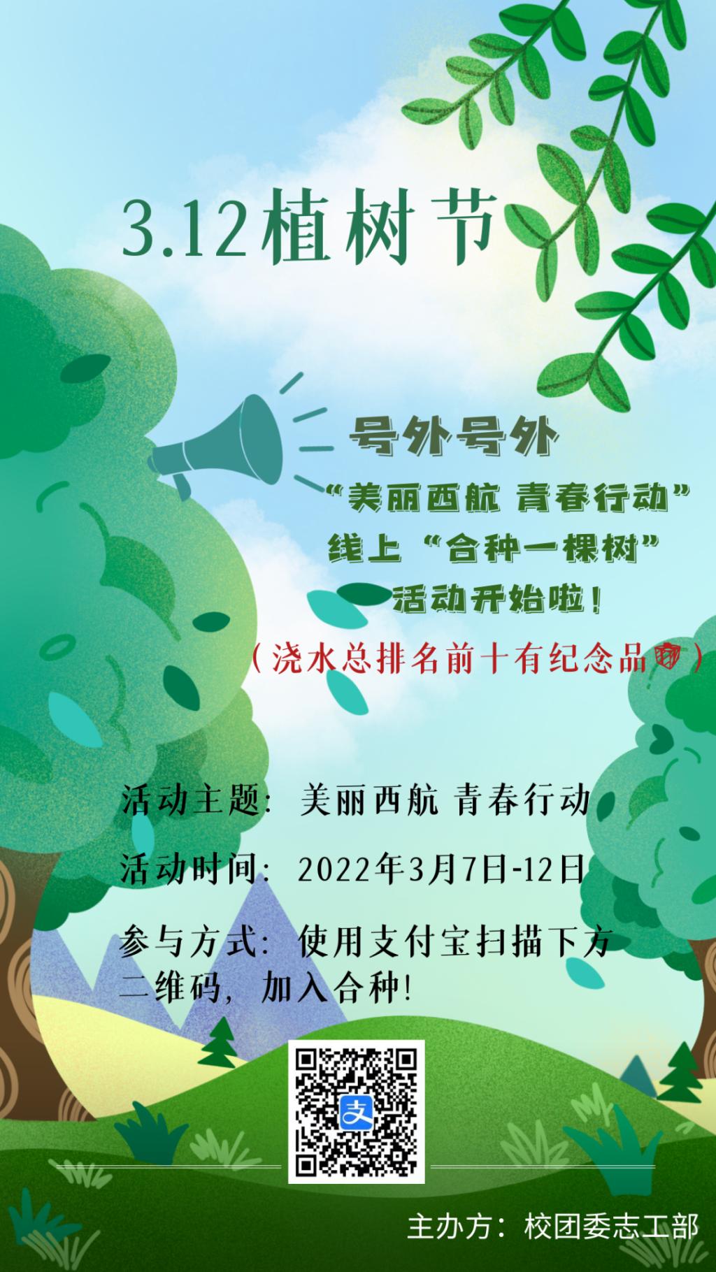 为营造植绿、爱绿、护绿、兴绿的良好氛围,提高西航学子的生态环保绿色低碳意识,2022年3月7日——2022年3月12日,由共青团ac米兰官方网站委员会主办的"美丽西航 青春行动”植树节线上“合种一棵树”活动开始啦!